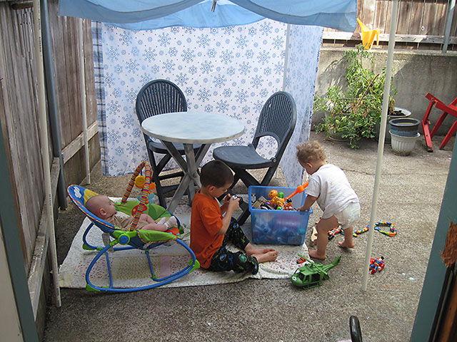 This is one of the more fun things for me to do. I like to stretch a clothesline across the bedroom, drape a queen or king sized sheet across it and tack the corners onto the floor. I make sure I have the "back" of the sheet tent flush with the wall so it's partially enclosed. Then I lay pillows and blankets on the floor inside the "Fort" and throw in a bunch of those board books. Adrian loves Hot Wheels cars so for him, I put in a bucket of cars. As long as they don't pull it down, this is a great way to keep the little guys occupied.